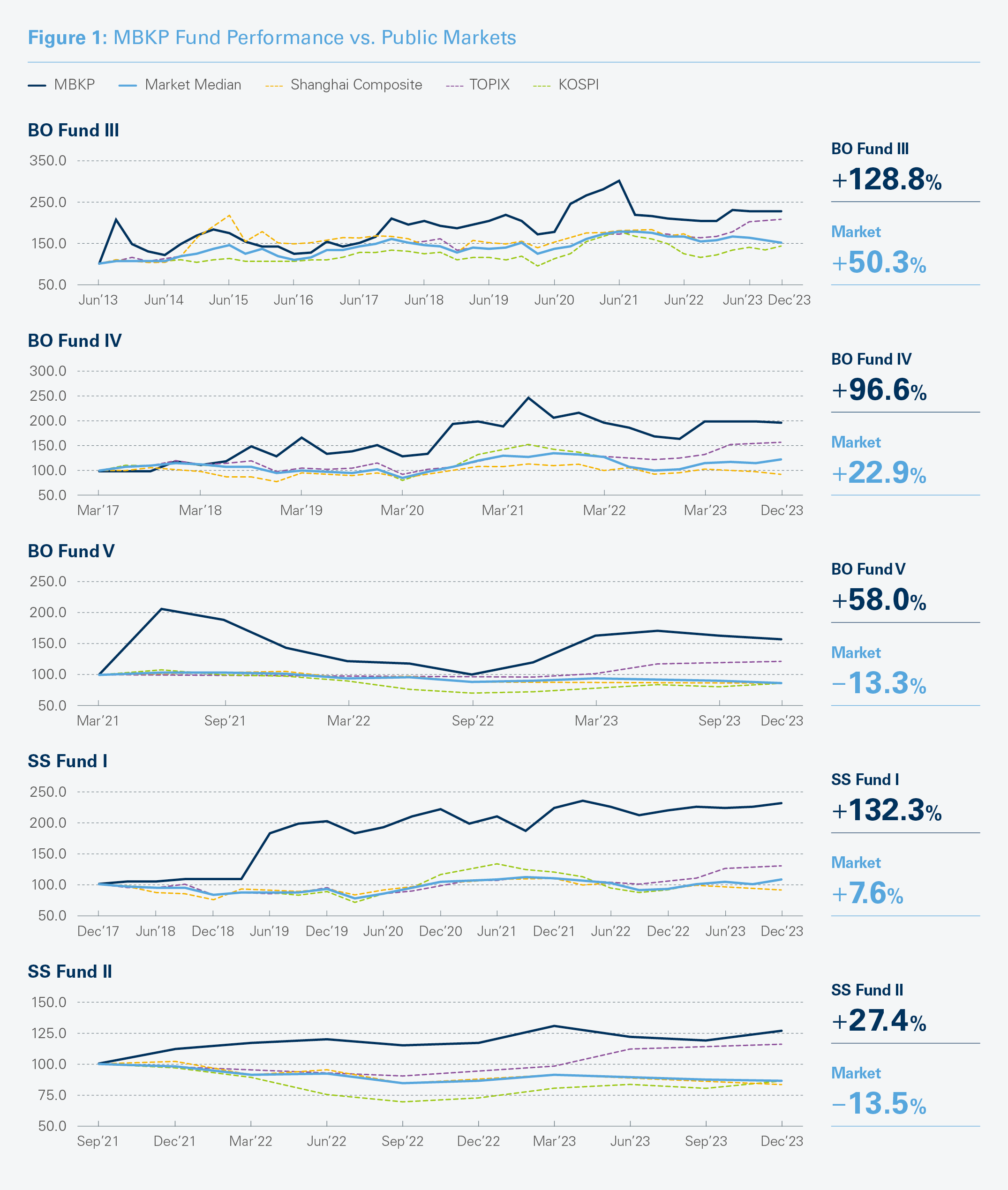 TWO THOUSAND TWENTY-THREE saw a rare divergence of the private markets from public markets in performance. Equity markets surged across the world, despite wars in the Middle East and Ukraine and the ongoing trade war between the U.S. and China. The S&P 500 rose by 24.7%; in our region, the Nikkei rallied by a remarkable 30.1% and KOSPI 19.3%, with only the Shanghai Composite declining (by 4.5%). In private equity, however, the headwinds that gathered in the second half of 2022, from the “denominator effect” to rising financing costs, persisted in 2023. Fundraising, deal volume, portfolio performance and particularly distributions were down across the industry. Globally, funds closed fell by 38%, deal value by 37% and exit value even more sharply, by 44%. MBK Partners bucked the trend with another strong year in raising funds, deploying capital and creating value in our portfolio. But we were not immune from the adverse conditions in the exit channels, resulting in a down year in distributions. The liquidity super-cycle of 2020-22 is clearly behind us, but we see signs of a normalized cycle beginning this year.