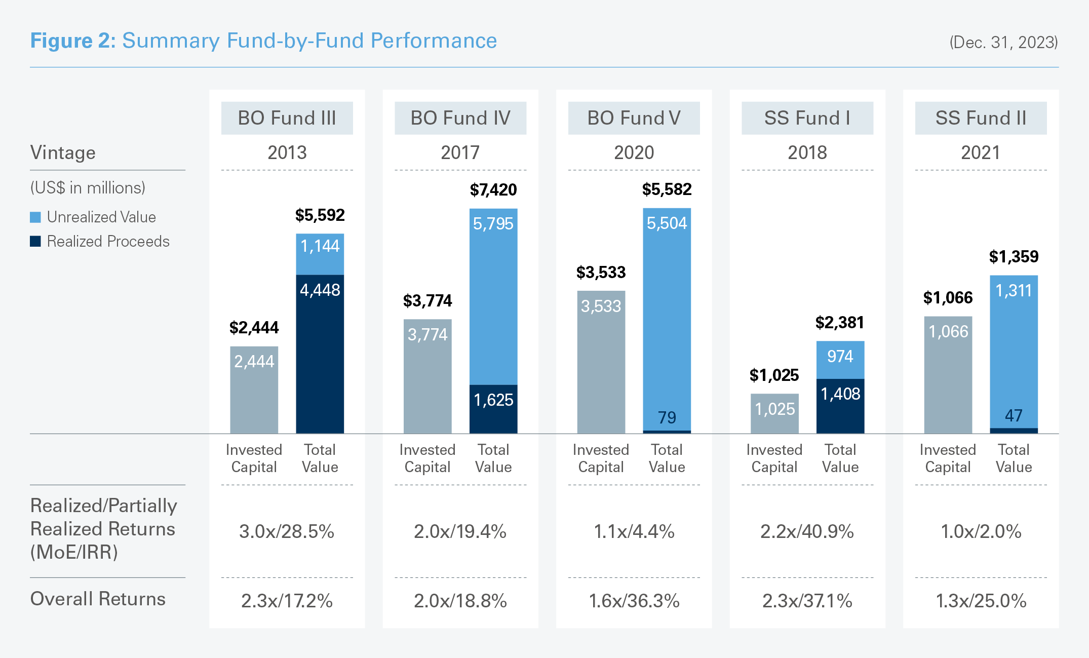 On an absolute returns basis, the aggregate marks for our five active funds stood at MoC of 1.9x and IRR of 20.5% at year-end 2023. As shown in the following chart, Buyout Fund III was at 2.3x and 17.2%, Fund IV at 2.0x and 18.8%, Fund V at 1.6x and 36.3%; Special Sits I at 2.3x and 37.1% and Special Sits II at 1.3x and 25.0%.