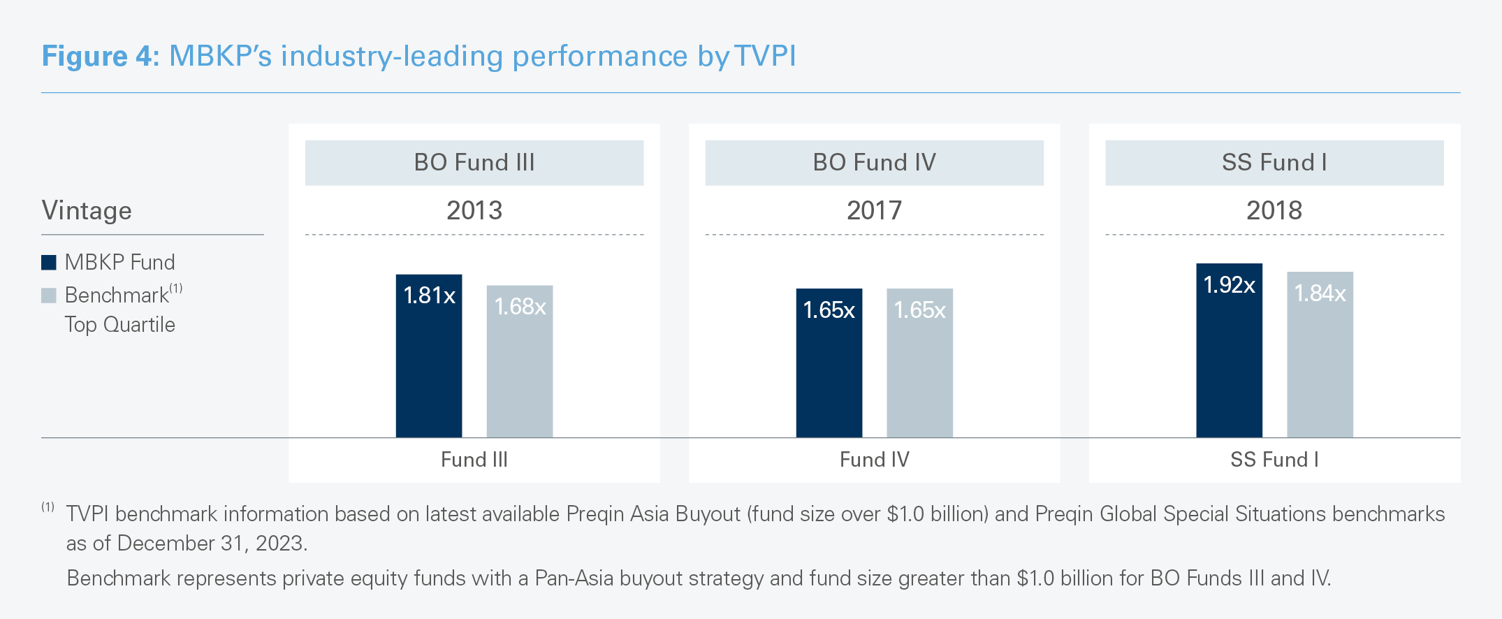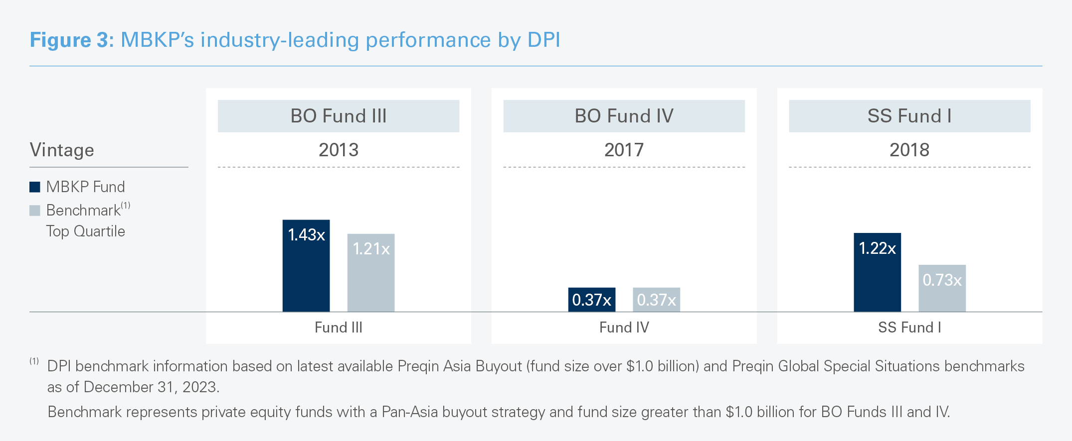 As we have emphasized, distribution amount and distributions-to-paid-in capital multiple (DPI) are the most meaningful measures of performance. Distribution numbers have integrity. We believe our returned amount, now at $18.7 billion, makes us the leader among Asia-based GPs. Our performance leadership is further buttressed by DPI (as well as its cousin, total value-to-paid-in capital). As highlighted in the following table, we continue to outperform in both DPI and TVPI the top-quartile benchmarks in our industry.